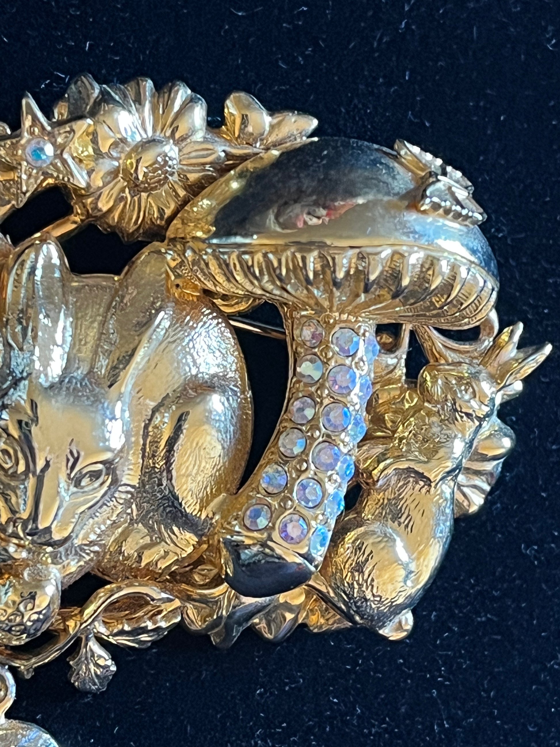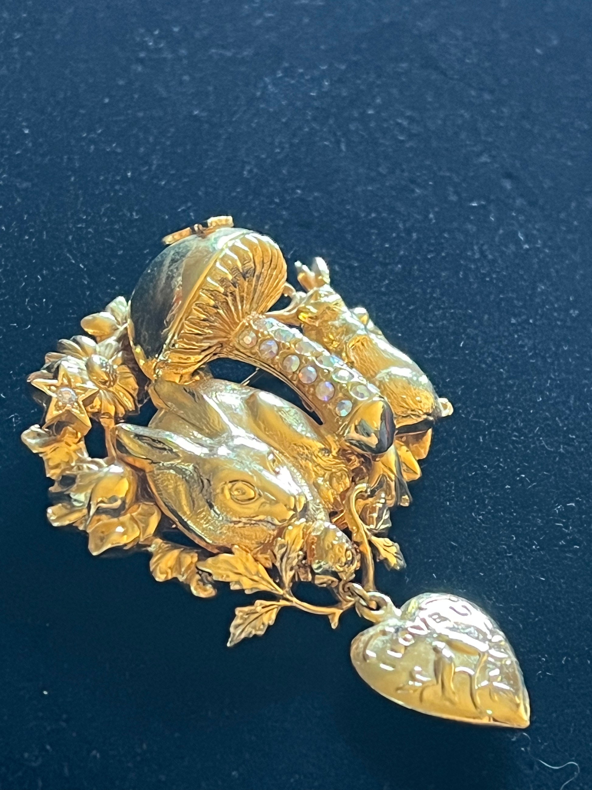 A magical and highly detailed signed Kirks Folly brooch featuring a charming woodland scene with a bunny, squirrel, floral accents, and a sparkling mushroom adorned with aurora borealis rhinestones. A dangling heart charm engraved with “I Love U” adds a romantic finishing touch.